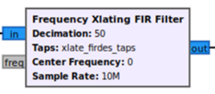 - Taps – вектор значений коэффициентов КИХ-фильтра, вычисляемых с помощью встроенных функций firdes.low_pass или complex_band_pass. При подаче на вход «in» вещественных отсчетов сигнала коэффициенты КИХ-фильтра рассчитываются с помощью вызова функции Gnu Radio firdes.low_pass, в комплексной форме с помощью вызова функции firdes.complex_band_pass.